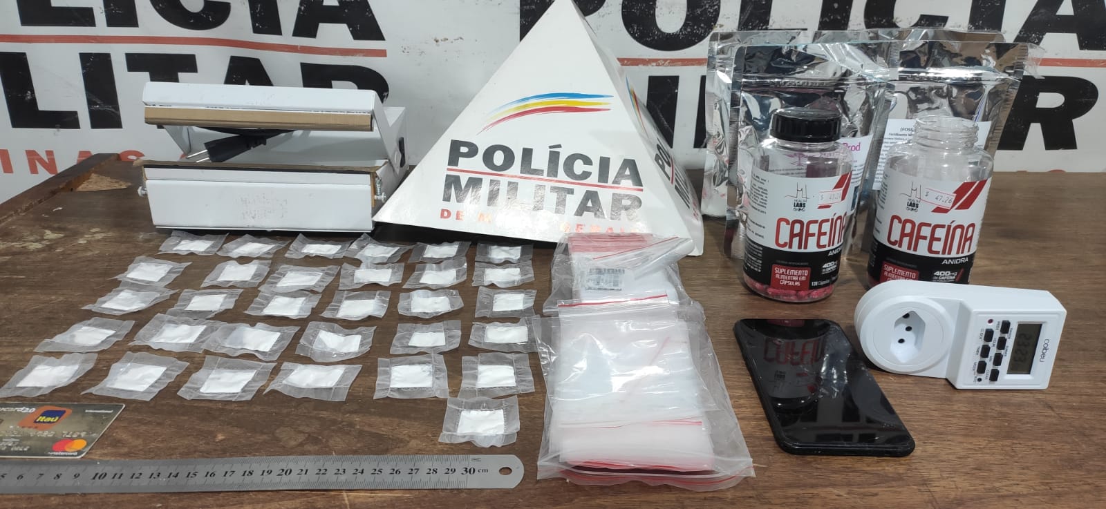 Ao todo foram recolhidos: 31 papelotes de cocaína, recipientes plásticos, aparelho celular e uma máquina usada para embalar drogas.