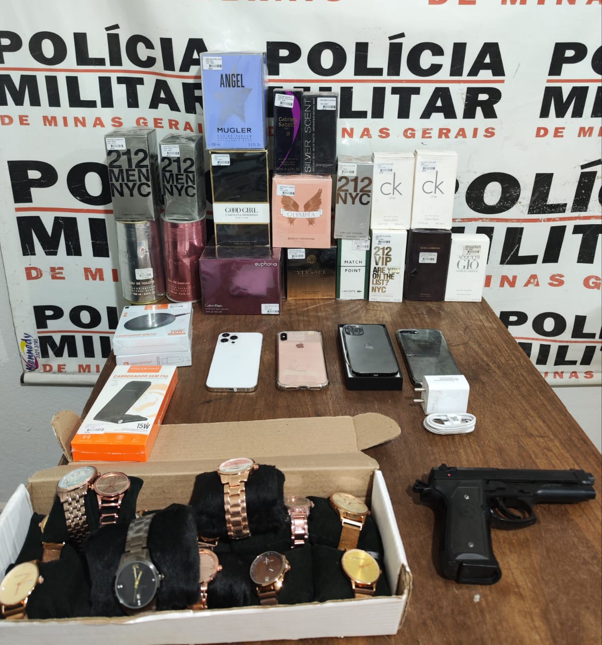 Foram recuperados os seguintes materiais roubados: 01 réplica de pistola automática, 04 aparelhos celulares (iPhone), 20 perfumes importados, 14 relógios de pulso, 03 carregadores portáteis, 01 fonte de carregador e cabo e 02 mochilas.