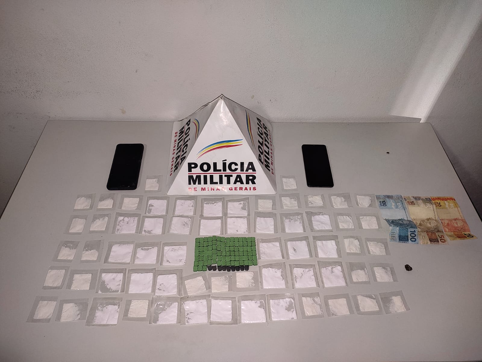 Dentre os abordados, foi apreendido com um homem de 34 anos de idade, 03 papelotes de Cocaína e um aparelho celular. Durante o desenrolar da ocorrência, ele disse aos policiais militares, que havia adquirido o entorpecente de um jovem de 24 anos de idade. Ao abordar esse segundo autor, foram localizados e apreendidos 59 papelotes de Cocaína; 01 bucha de Maconha; 96 comprimidos de Ecstasy; R$170,00 em dinheiro e 01 telefone celular, parte desta droga estava escondida em sua residência.