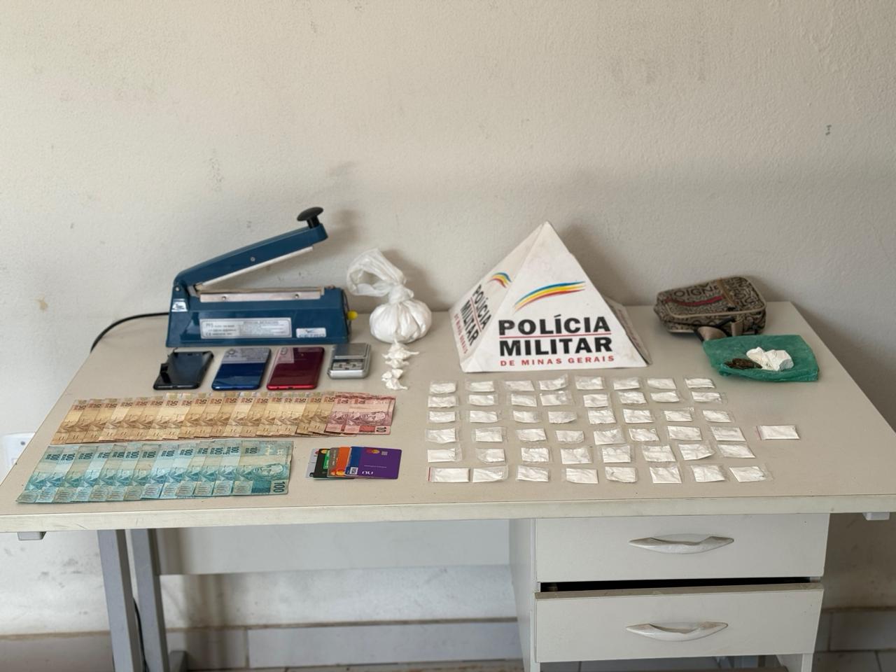 Os policiais militares adentraram à residência e abordaram dois autores sendo um homem de 27 anos, e um mulher de 23 anos de idade, após buscas vistoria pela casa, foram encontrada e apreendidas as seguintes drogas: 49 papelotes de Cocaína; 05 “endolas” de Cocaína; 01 torrão de Cocaína que, fracionado, renderia cerca de 30 papelotes de cocaína; 01 tablete de Maconha; 01 porção de Cocaína que poderia render 200 papelotes. Também foram apreendidos utensílios para fracionar e embalar as drogas 01 máquina seladora de embalagem manual térmica (prensa industrial); 01 balança de precisão, bem como 03 telefones celulares; R$2.220,00 em dinheiro 03 cartões bancários em nome do autor e outros 03 cartões em nome de terceiros.