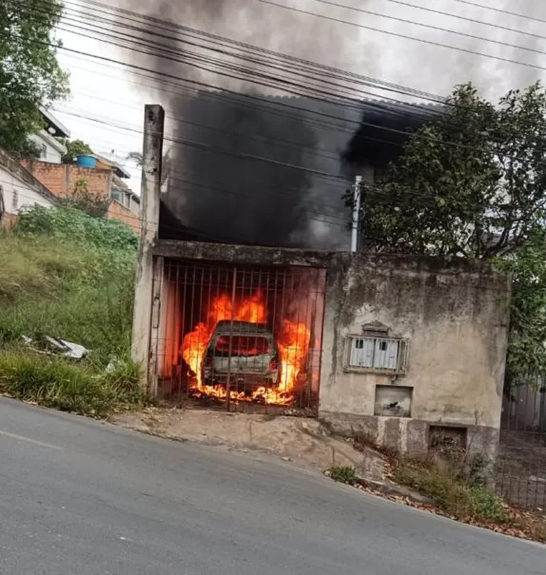 Um carro pegou fogo na garagem de uma casa no Bairro São João de Deus, em Divinópolis. Ninguém ficou ferido.