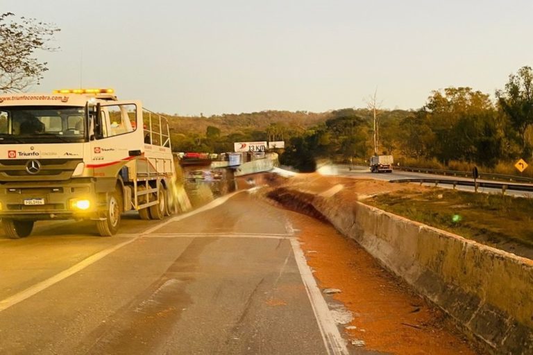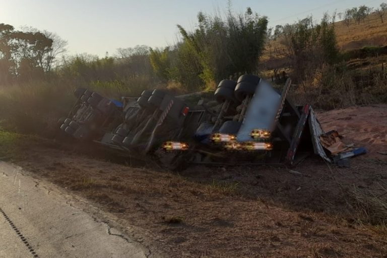 Um acidente envolvendo uma carreta bitrem carregada com uma carga de sorgo foi registrado na madrugada desta terça-feira (08) na
