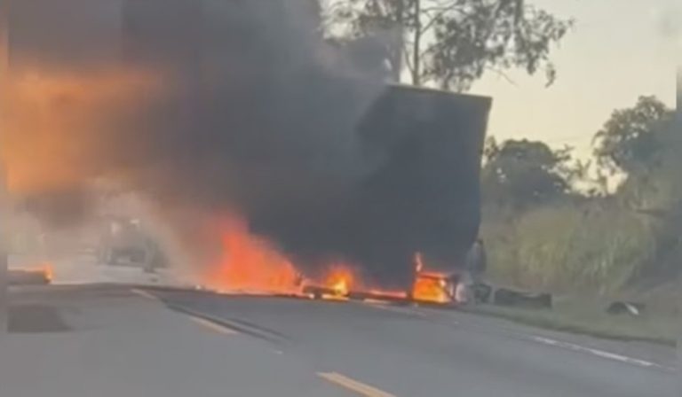 Um caminhão carregado com bebidas pegou fogo na manhã desta terça-feira (16), na MG-050, em Pimenta. A ocorrência foi registrada