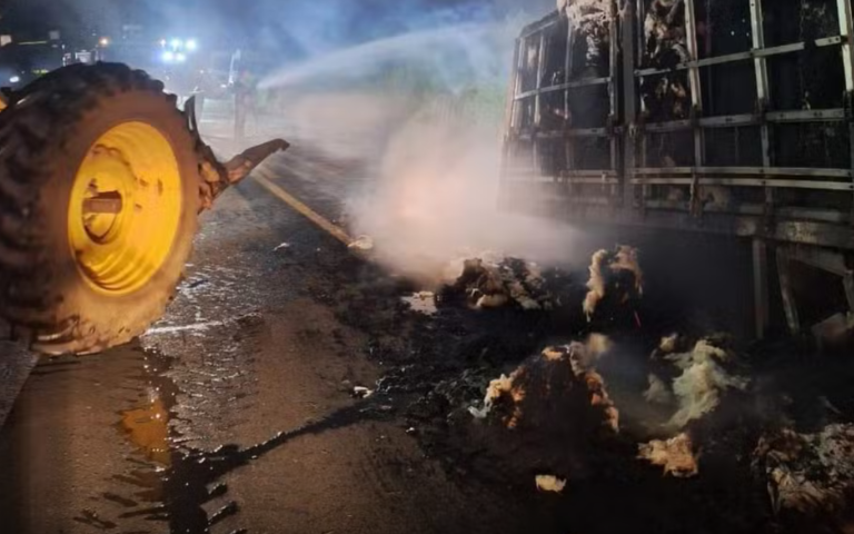 Um incêndio em uma carreta bitrem, carregada com 32 mil kg de algodão, comprometeu o trânsito da BR-354 por aproximadamente