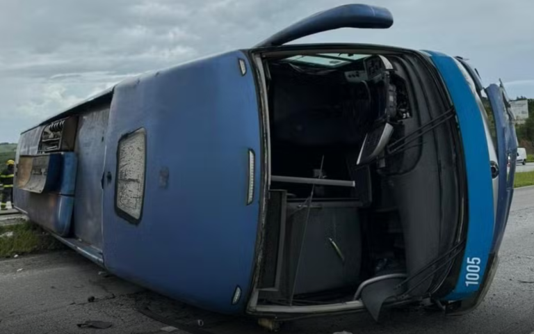 Um ônibus tombou no km 621 da BR-381, em Oliveira, no Centro-Oeste de Minas, na tarde desta quarta-feira (7). As